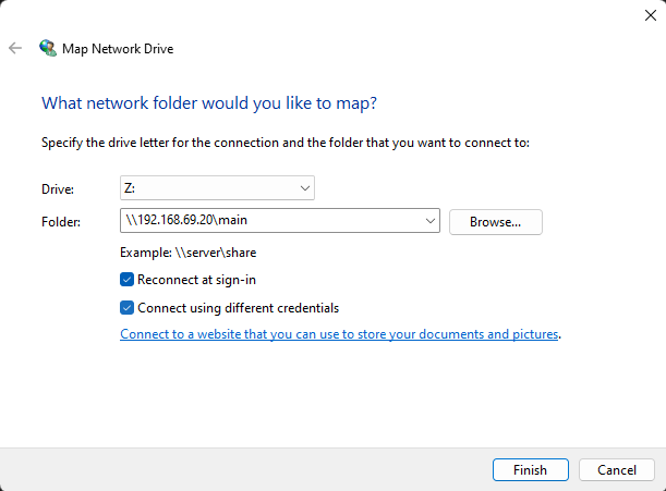 Now enter in the server SMB uri "\\192.168.69.20\main", the drive letter doesn't matter, select "Connect using different credentials".